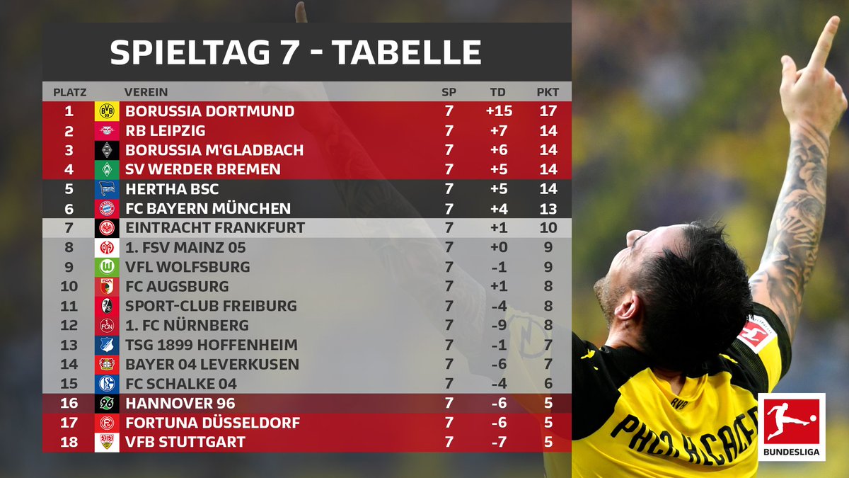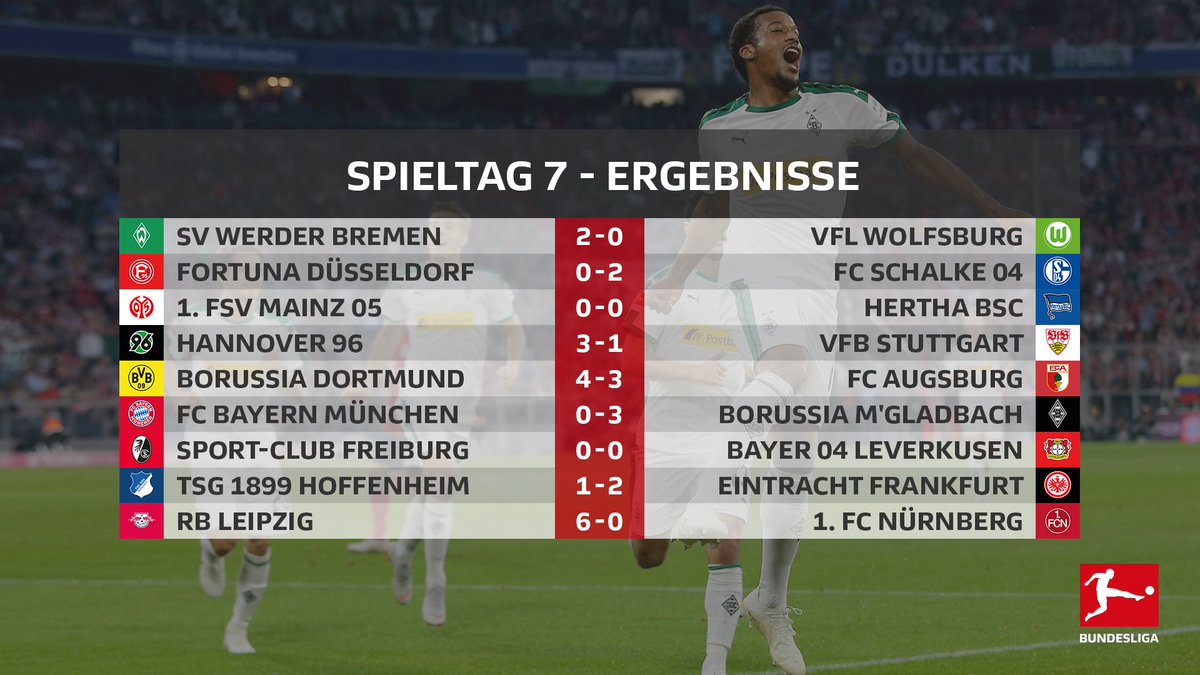 No fim, o líder do campeonato permanece sendo o Borussia Dortmund, isolado com 17 pontos; seguido pelo RB Leipzig, B. M'gladbach, Werder Bremen e Hertha Berlin (todos com 14 pontos); O Bayern de Munique terminou em sexto colocado, apenas à frente do Eintracht Frankfurt e companhia. Veja a tabela completa: